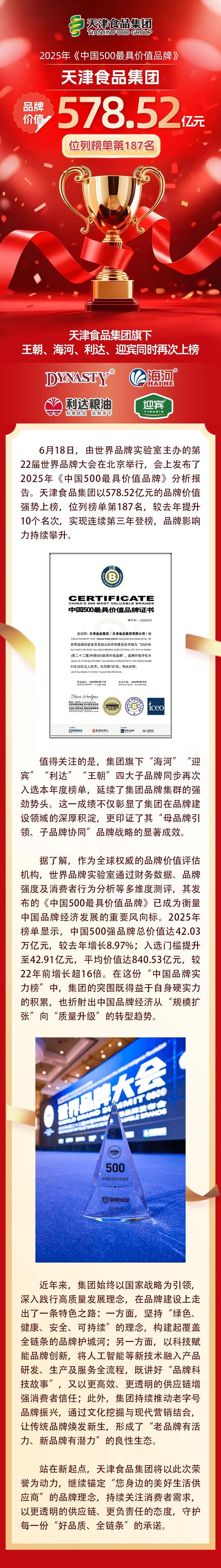 集團連續(xù)三年榮登“中國500最具價值品牌”榜單 旗下王朝、海河、利達、迎賓再次同時上榜